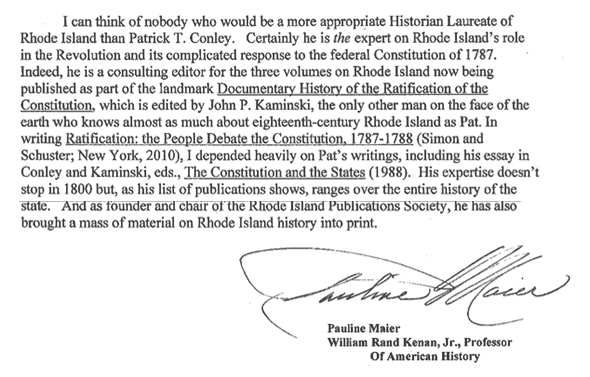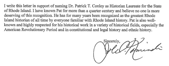 Patrick Conley’s interest in becoming the first Historian Laureate of Rhode Island prompted him to solicit letters of recommendation addressed to the Secretary of State (the appointing authority) relative to his qualifications and suitability for that newly-created post.